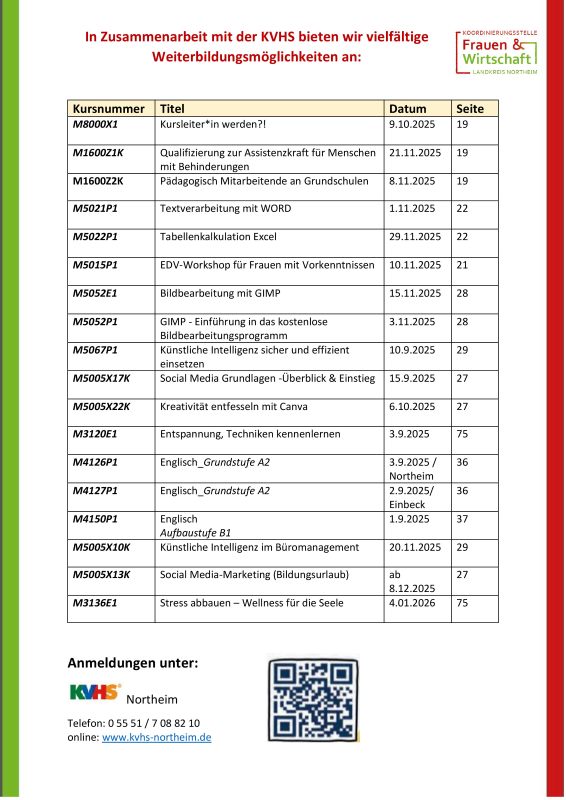 In unserem aktuellen Programm finden Frauen, Berufsrückkehrerinnen, Beschäftigte in Elternzeit als auch Unternehmen aus der Region viele ortsnahe Seminare und Workshops sowie Online-Informationsveranstaltungen im Landkreis Northeim.